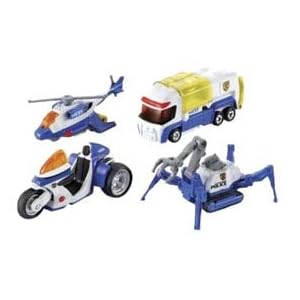 Patrol your world of Tomica with this set of four Hyper City Rescue Police Vehicles. Includes helicopter with moving rotor, 3 wheeled motorbike (compatible with Tomica characters - not supplied in this pack), a futuristic crab runner with moving legs and articulated arm, and a police truck. These diecast vehicles are shown in great detail and are a great addition to any playset.