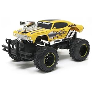 The Chevy SS 454 Monster Muscle Remote Control Truck is big, brash and very bright. Built to 1:16 scale, this loud yellow truck is 30cm long and has four monster tyres to run over anything in its way. The four directional remote control works at a distance of up to 30 metres , and uses 27 MHz frequency so you can drive it alongside the Pontiac GTO remote control truck . The Chevy needs 7 x AA batteries (five for the car, two for the remote control). Batteries aren't included but are available from our batteries section .