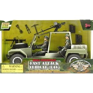 22cm Fast Attack Vehicle (FAV) with swivel mounted machine gun, circular mount cannon, front winch and rubber wheels. Includes two fully articulated action figures and accessories. The figures are scaled to fit into the vehicle at 1:18. The equipment and accessories in this set are highly detailed and authentic.